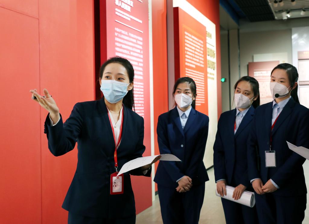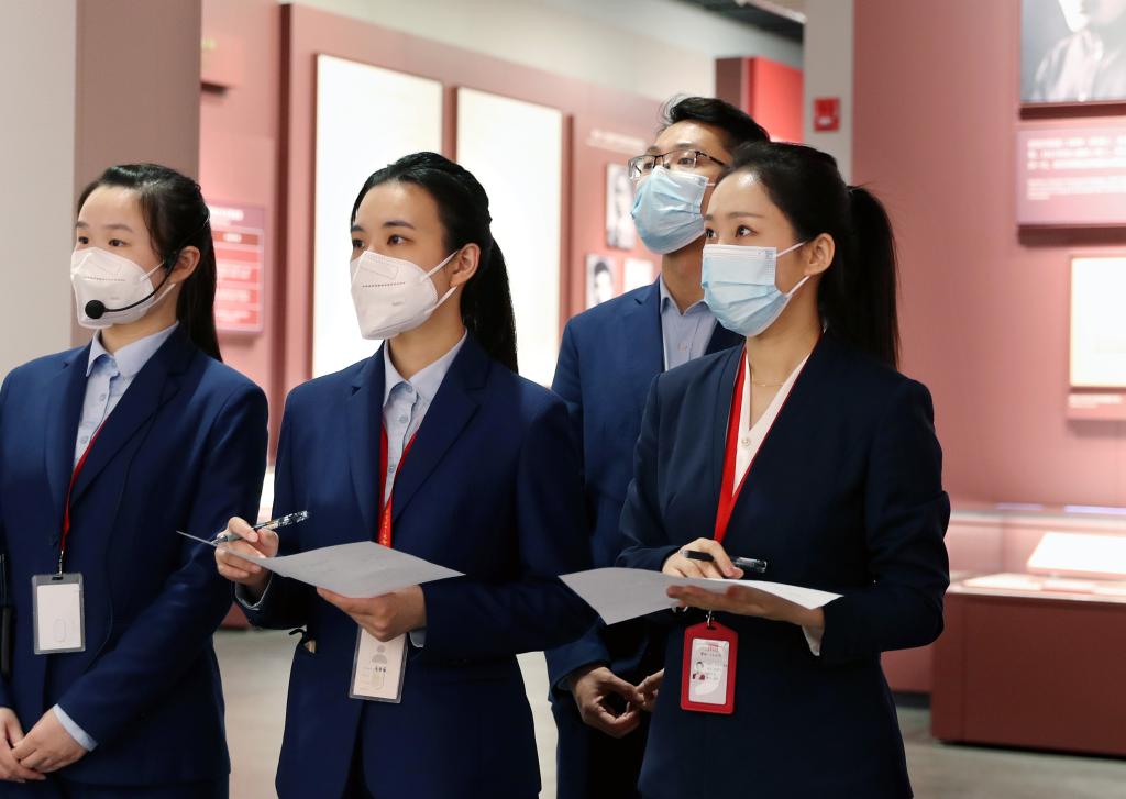 6月29日,張欣怡(左一)與中共一大紀(jì)念館的宣教專員們在館內(nèi)進(jìn)行講解演練。新華社記者 劉穎 攝