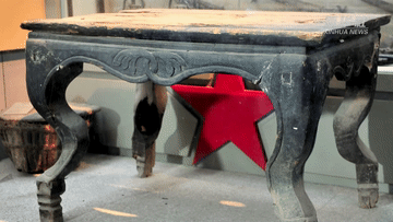 金寨縣革命博物館展示的穿石廟會議桌。 新華社記者 白斌 攝
