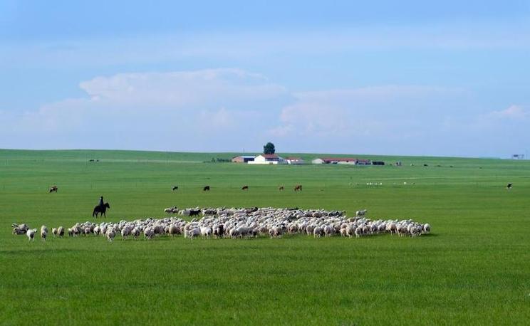 內蒙古錫林郭勒盟烏拉蓋管理局境內的草原上,牧民在放羊。新華社記者賈立君 攝
