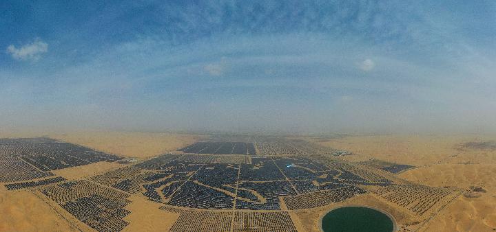 內蒙古達拉特光伏發(fā)電應用領跑基地的“駿馬電站”。新華社記者劉磊 攝