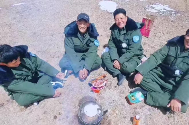 雙湖縣管護(hù)員在巡邏時用餐。(受訪者提供)