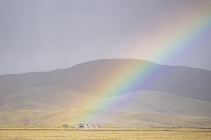 彩虹下的羌塘國家級自然保護(hù)區(qū)藏野驢。(新華社記者孫瑞博攝)