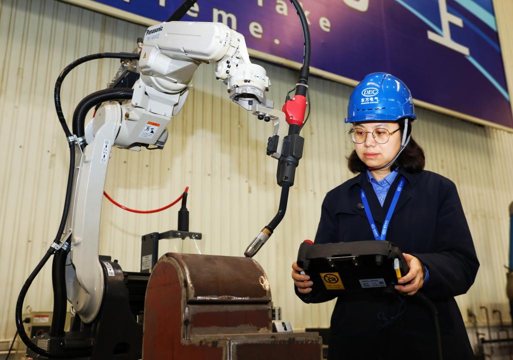 全國(guó)人大代表曹天蘭正在進(jìn)行焊接機(jī)器人模擬試驗(yàn)。賈偉明攝