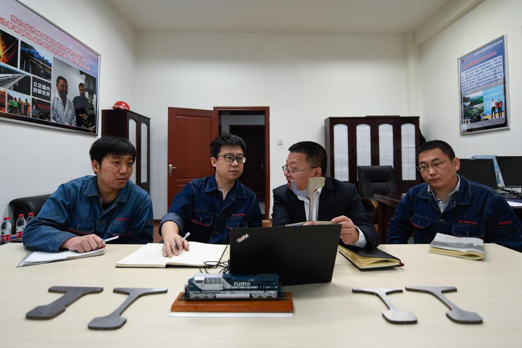 全國(guó)人大代表鄒明(右二)與同事一起討論道岔設(shè)計(jì)方案。胥冰潔攝