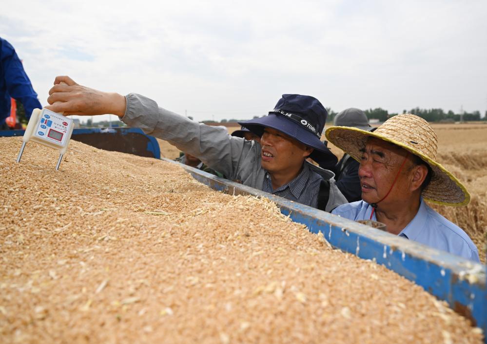 5月29日,在太和縣淙祥現(xiàn)代農(nóng)業(yè)種植專業(yè)合作社,徐淙祥(右)和農(nóng)技專家一起測量小麥中的含水量。新華社記者周牧 攝