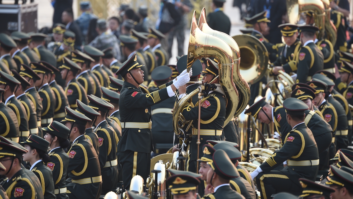 10月1日上午,慶祝中華人民共和國成立70周年大會將在北京天安門廣場隆重舉行。 這是解放軍聯(lián)合軍樂團(tuán)為演奏做準(zhǔn)備。 新華社記者 姜克紅 攝