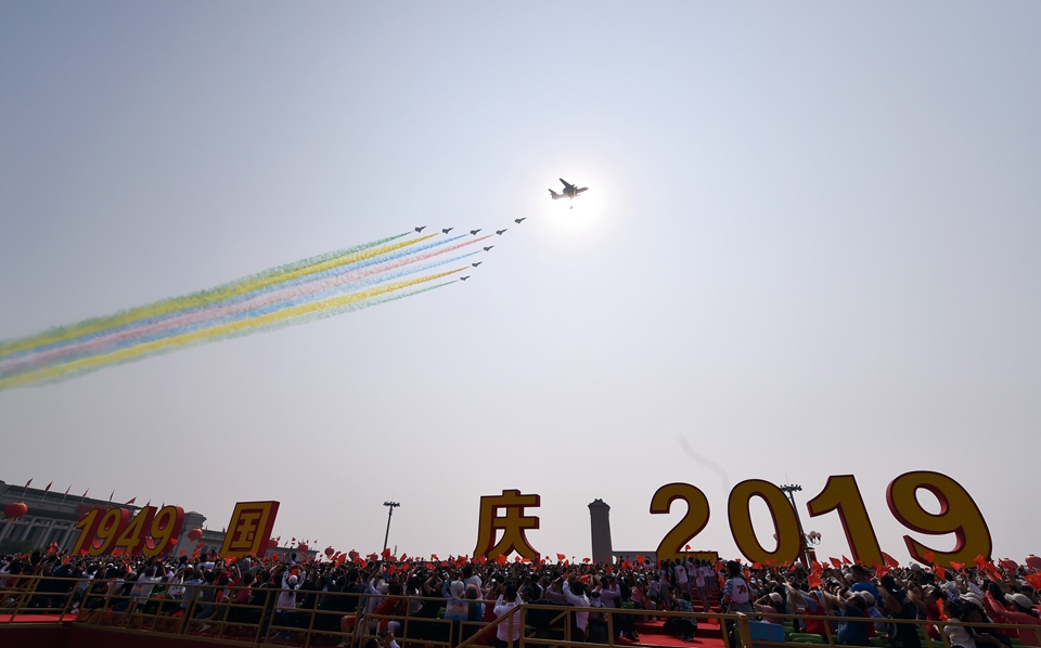 10月1日上午,慶祝中華人民共和國(guó)成立70周年大會(huì)在北京天安門(mén)廣場(chǎng)隆重舉行。這是受閱的領(lǐng)隊(duì)機(jī)梯隊(duì)。新華社記者 梁旭 攝