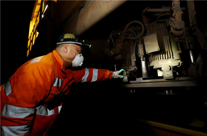 ↑1月9日,鐵路員工對鋼軌打磨車進行檢查。 新華社發(fā)(王翔 攝)