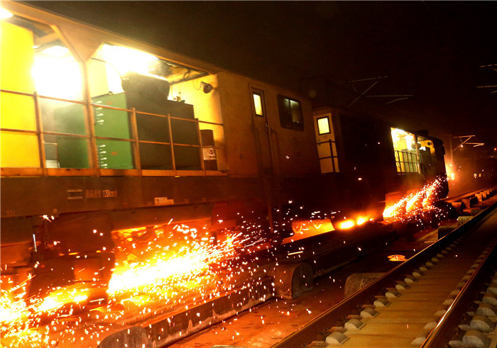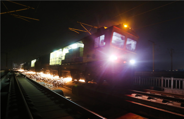 ↑1月9日,正在進行鋼軌打磨作業(yè)的打磨車下火花四濺。 新華社記者 方喆 攝