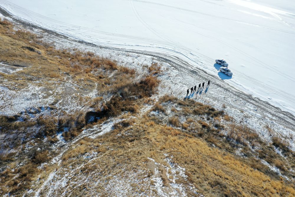 ↑1月23日,呼倫貝爾市公安局呼倫湖國(guó)家級(jí)自然保護(hù)區(qū)分局小河口派出所民警在呼倫湖岸上的高處巡邏(無(wú)人機(jī)照片)。