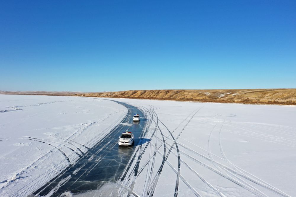 ↑1月23日,呼倫貝爾市公安局呼倫湖國(guó)家級(jí)自然保護(hù)區(qū)分局小河口派出所民警駕車(chē)在結(jié)冰的呼倫湖上巡邏(無(wú)人機(jī)照片)。