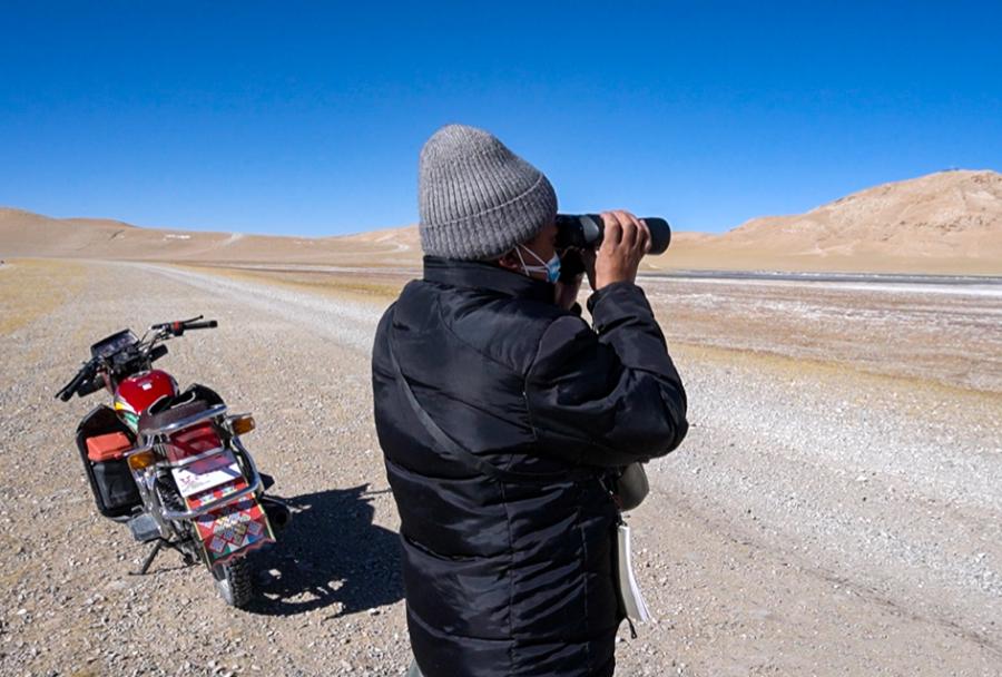 次成塔青拿著望遠(yuǎn)鏡觀察遠(yuǎn)方(2021年2月攝)。 新華社記者 田金文 攝