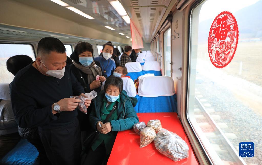 1月15日,從吉林通化開(kāi)往遼寧丹東的4318次列車(chē)上,旅客購(gòu)買(mǎi)山貨。新華社記者 楊青 攝
