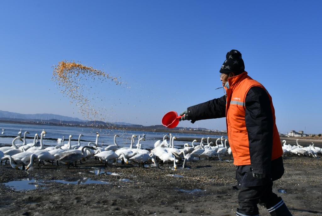 1月18日,劉志斌在為過冬的大天鵝補(bǔ)充食物。(新華社記者徐速繪攝)