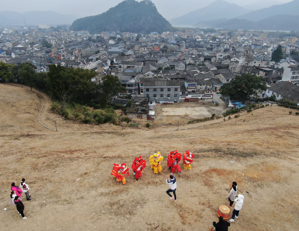 ↑1月20日,在前童古鎮(zhèn)邊的小山上,童攀峰帶領(lǐng)舞獅隊(duì)進(jìn)行訓(xùn)練(無(wú)人機(jī)照片)。